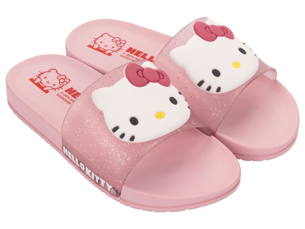 Nosso clássico slide ganha vida com a personagem mais fofa e icônica do momento! Em rosa glitter e com um maxi aplique em plastisol 3D do rosto da Hello Kitty, esse modelo une conforto e estilo de forma divertida.
