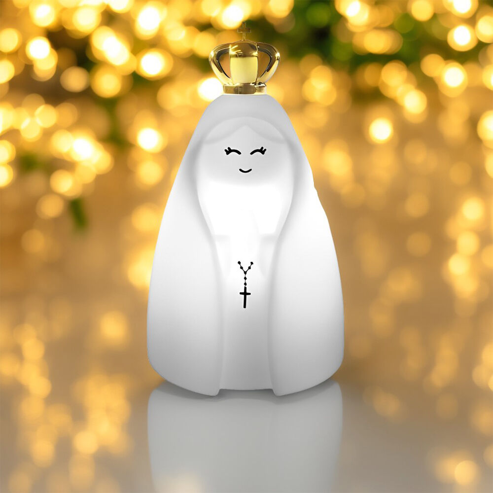 A Luminária Nossa Senhora traz um toque de fé e serenidade ao seu ambiente, proporcionando uma iluminação indireta aconchegante e cheia de significado. Perfeita para oratórios, quartos, salas e espaços de oração.rnrn- Design delicado e inspirador – Transmite paz e devoção na decoração.rn- Luz indireta acolhedora – Iluminação suave para ambientes aconchegantes.rn- Coroa metalizada dourada – Um detalhe especial que valoriza ainda mais a peça.rn- Versátil e prática – Ideal para apoiar sobre mesas, bancadas e oratórios.